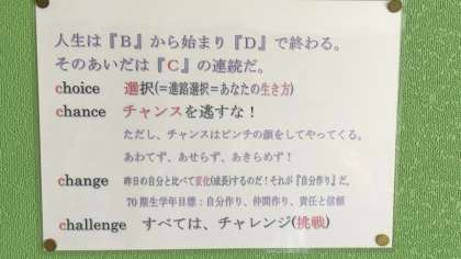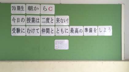 3年が学校生活を送る、本館3階の階段を上がった所に、学年の先生達からこんなメッセージが掲げられています。