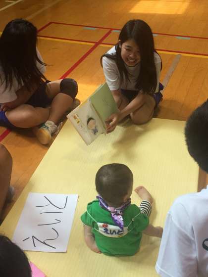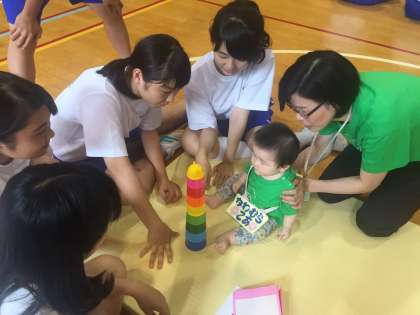 各班で赤ちゃん先生からご挨拶のスキンシップの後、少しの間一緒に遊んだり、絵本を読み聞かせたりして、子育て体験。