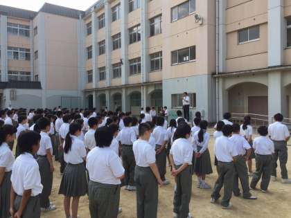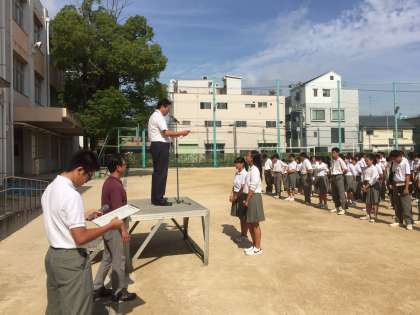 冒頭、表彰状の伝達式がありました。今回は、テニス部が大阪府立阿倍野高校杯でダブルス第3位に入賞しました。