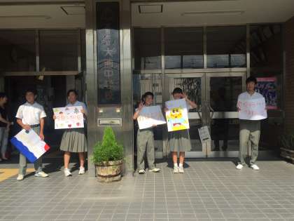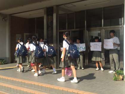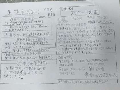 風紀委員会だ! 其の一 公開日 2016/07/08 更新日 2016/07/08 お知らせ 先日、生徒専門委員会の様子をお伝えしたところですが、今日生徒会だより7月号が配られました。 そこには、各学年、各専門委員会、学校全体の月間目標が書かれています。中でも風紀委員会は『大きいあいさつをして暑さに勝とう』を月間目標に掲げ、毎朝委員会活動を行っています。 いいね(0)