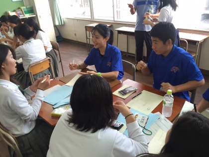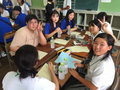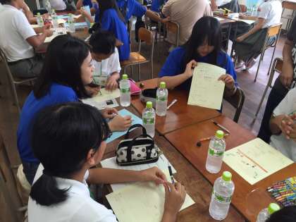 国際理解教育 其の二 公開日 2016/09/09 更新日 2016/09/09 お知らせ 多目的室でのセレモニーの後、それぞれが3教室で4グループに分かれて交流を行いました。 お互いが初対面なので、コミュニケーションが取りやすいよう、予めワークシートを用意して、テーマをそれぞれが選択して、絵も交えながら自己紹介を行いました。 いいね(0)