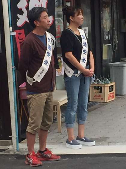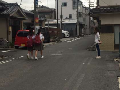 秋の全国交通安全週間に合わせて台風一過の今日、朝からPTAさんが通学路に立ち、恒例のタスキをかけて交通安全指導を行いました。