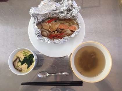 今回のメニューは、茶碗蒸しとサーモンのホイル焼きです。 これが実に美味! これまた星みっつです。