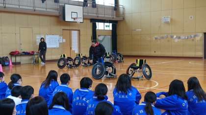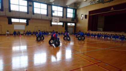 17日3〜4限に1年生全員で車イスを使ったアメリカンフットボールである「ホイールチェアフットボール」を体験しました。講師はWheelchair Football Japanの糸賀亨弥さん。人権学習の中で「障がい」のある人たちのことを考えるにあたって、まず知ることから始めようと、取り組みました。