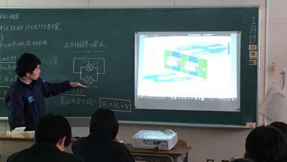通信速度がまだ遅いので、複数タブレットを利用するような授業はまだ難しい現状ですが、色んな教科の授業において、ICTを活用した授業を行っています。今ある環境の中で、いかにしてICT事業を進めていくか、各教科担任の知恵の絞りどころです。写真は2年生理科の授業です。