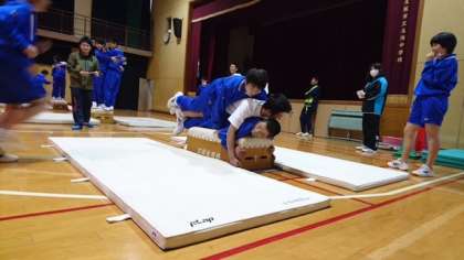 学年最後の行事、学年レクを行いました。実行委員による企画、運営で、4種目のプログラムです。まずは「跳び箱何人のれるかな?」