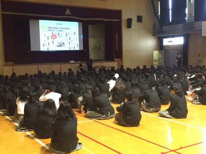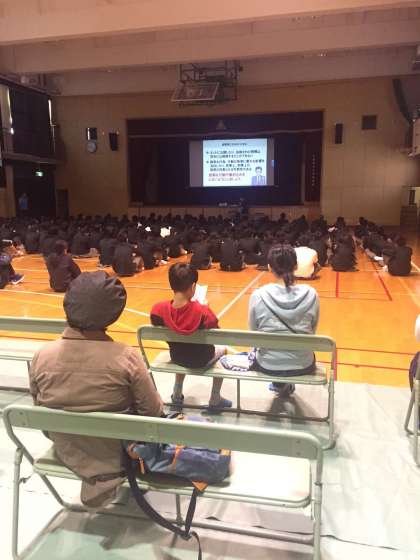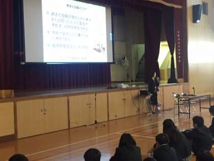 講師の方と校長先生との事前の打ち合わせで、現在の教育課題である『いじめ』問題について、SNSからいじめに発展する事例が後を絶たない社会現象の現実から、今回は特にいじめ問題に重点を置いた講演内容になるようお願いして実施されました。