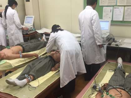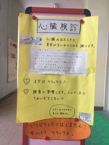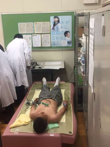 生徒一人ひとり、心電図を測定して心臓が正常に機能しているかを検診です。生徒も慣れない検診に緊張と戸惑いを隠せません。