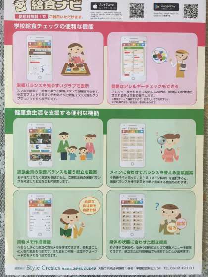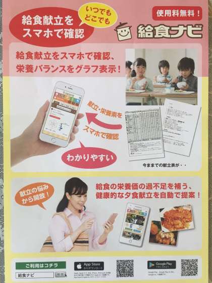 先週に画像のような。『給食ナビ』というお知らせを配布しています。登録して貰えれば、いつでも何処でもスマホで検索可能です。おまけに給食をふまえた1日のカロリーを鑑みたレシピまでお知らせしてくれるスグレモノです。