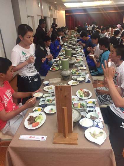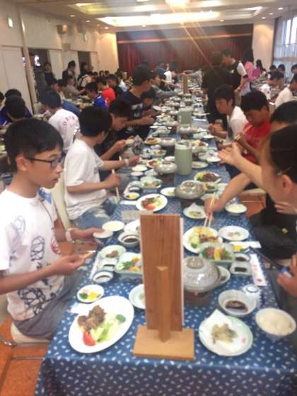 生徒達にとっては、みんなと食べる夕食も修学旅行の大きな楽しみです。ワイワイガヤガヤ笑顔が絶えません。