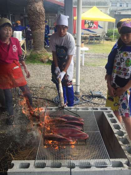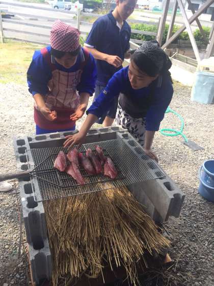 カツオのたたき其の五 公開日 2017/06/01 更新日 2017/06/01 お知らせ 柵になったカツオをかまどで藁で燻します。 藁の煙が充満する中、本格的なたたきの香りが。 期待が高まります! いいね(0)