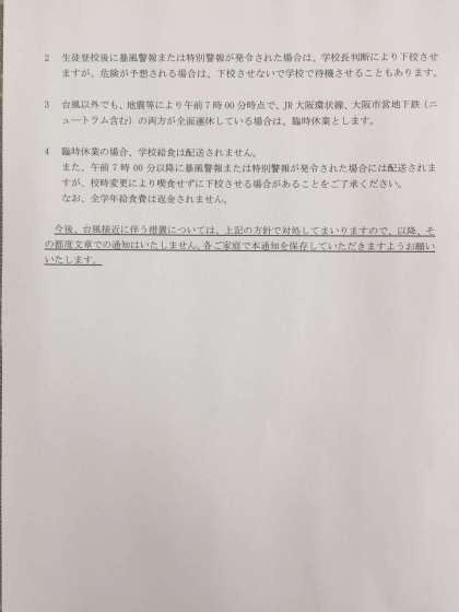 今後の台風接近に伴う措置等については、今回配布のプリントを流用いたしますので、熟読の上、保管方よろしくお願いいたします。