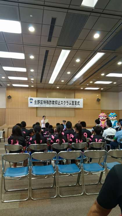 これが地域貢献だ 其の1 公開日 2017/08/17 更新日 2017/08/17 お知らせ 8月3日に生野警察からの依頼で、本校ラグビー部が生野区特殊詐欺抑止スクラム宣言式に参加しました。 宣言式では、生野警察署長から生野区管内での特殊詐欺、いわゆる『振り込め詐欺』の被害状況の報告があり、その後生野区長から『生野区特殊詐欺抑止スクラム宣言』が読み上げられ、宣言書への生野区警察署長、生野区区長、生野区社会福祉協議会会長の三者による署名が行われました。 いいね(0)