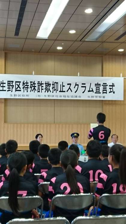 これが地域貢献だ 其の2 公開日 2017/08/17 更新日 2017/08/17 お知らせ 三者による署名の後、大阪市立大池中学校生徒を代表して、ラグビー部の陽川くんが、『特殊詐欺抑止声かけ宣言』を堂々と読み上げ、セレモニーの最後を飾りました。 いいね(0)
