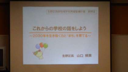 更に、課題解決に向けたビジョンをこれからの『生野区の教育』としてまとめ提示され「教育の生野区」の創造をスローガンとして、未来志向のまちづくりをめざして、子どもたちの健やかな成長のために、この再編計画の必要性を強い想いと決意のもと訴えられました。