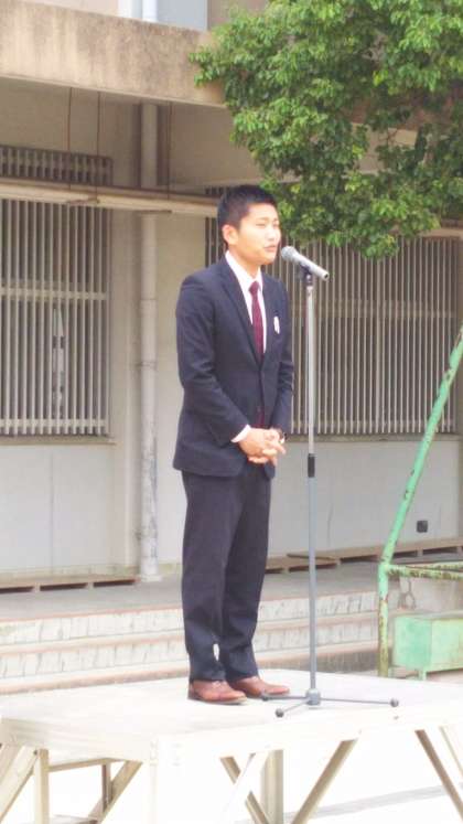 昨日、定例の全校集会がありました。校長先生から、4日から22日までの18日間、教育実習に来られた真本先生の紹介が有りました。