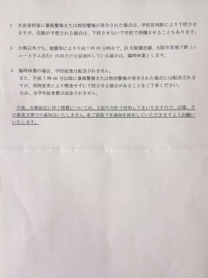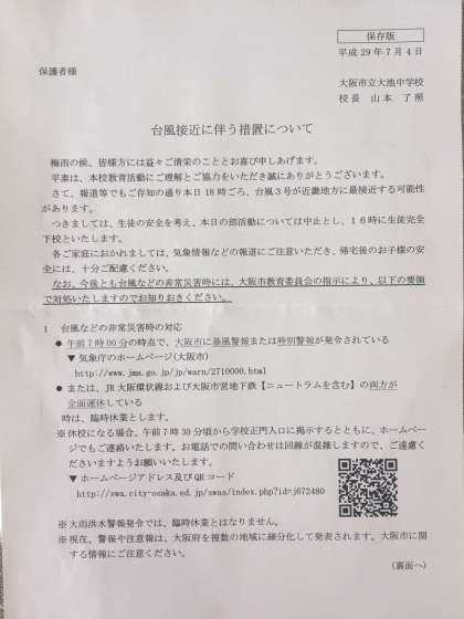 今後、22日に非常に強い勢力で九州南部・奄美の南東海上に進み、23日未明から朝に西・東日本に接近または上陸する恐れがあり、西・東日本は大荒れとなる可能性がある。23日朝は通勤通学時間帯の交通の乱れに注意が必要という事ですので、去る7月4日台風4号時に配布した『保存版 台風接近に伴う措置について』(本ホームページ右下 配布文章一覧参照)に従い、臨時休校等の措置を行う可能性が有ります事をご確認下さい。