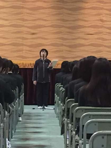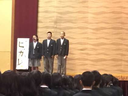 合唱コンクール 其の一 公開日 2017/11/20 更新日 2017/11/20 お知らせ 先週の木曜日、文化・芸術週間の第2弾、合唱コンクールが体育館で行われました。 1・2年生は各クラス課題曲と自由曲の二曲づつ、3年生は各クラス自由曲一曲の勝負です。 始めるにあたって、音楽科の金井先生からの諸注意の後、いよいよスタート。 幕が上がる前に、各クラスの代表からクラス紹介があります。 1年のトップバッターは2組。 1年の課題曲は『With You Smile』です。 いいね(0)