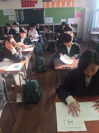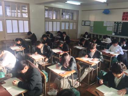 チャレンジ! 公開日 2018/01/11 更新日 2018/01/11 お知らせ 本日、1・2年生が平成29年度チャレンジテストにチャレンジしました。 1年生は国・数・英の三教科、2年生は理・社を加えて五教科で実施されます。 先ずは受験の諸注意、回答冊子の記入から始まって、国語からのスタートです。 定期テストと違って、この結果が将来の進路選択に反映されるとあって、気が抜けない緊張感が漂います。 いいね(0)