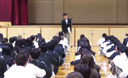 離任式では生徒会を代表して生徒会長の山本真也くんが挨拶をしました。