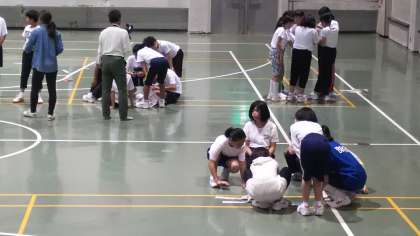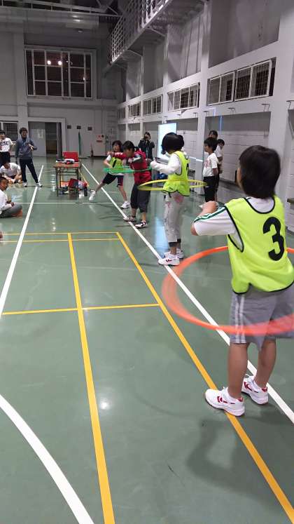 フラフープ対決や片足立ち、新聞紙を使ったゲームなど楽しんでます。