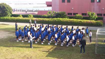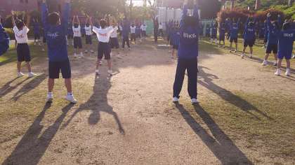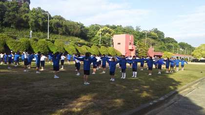 2日目の朝になりました。天気もよく日がまぶしいです。 朝のつどいでラジオ体操です。
