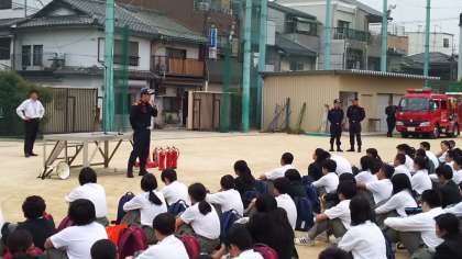 生野消防署から消防士さんに来て頂き、消防講話と水消化器による、模擬消火訓練を行いました。