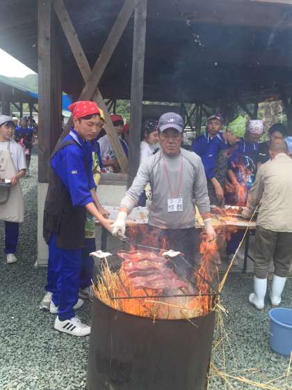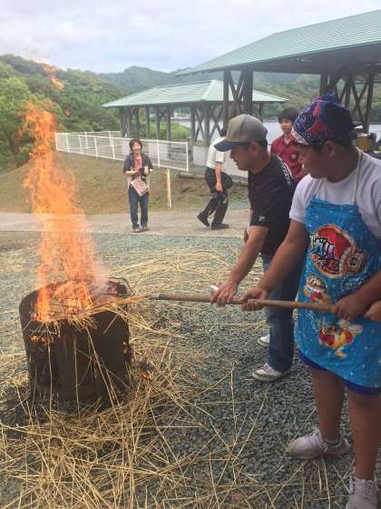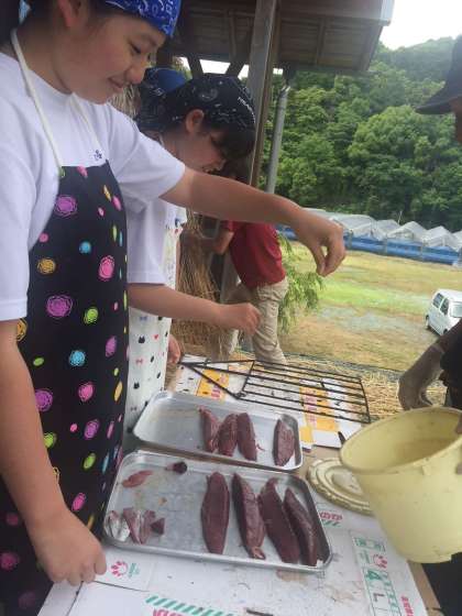 三枚に下ろせたら、柵にして塩を振って麦わらで燻します。