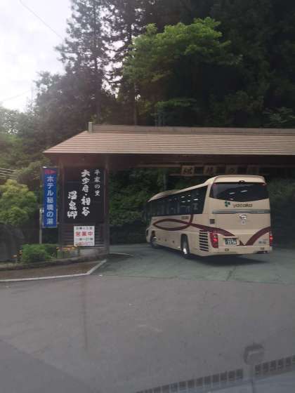 桂浜を出発し、約1時間半ほどバスに揺られ、途中激しい雨に見舞われながら、到着すれば雨も上がり、濡れることなく今日の宿へ。
