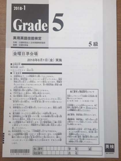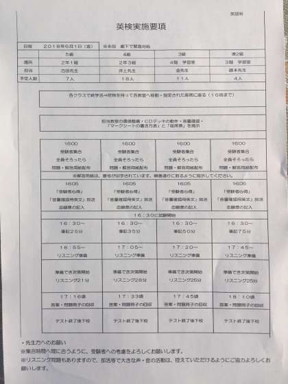 平成30年度 第1回 英検 其の一 公開日 2018/06/05 更新日 2018/06/05 お知らせ 6月1日の放課後、本校で希望者による、本年度第1回目の『実用英語技能検定試験』 が行われました。 受検級は5級から準2級までの4クラスに検定希望がありましたので、クラス別に4つ の部屋に分かれて受検です。 いいね(0)