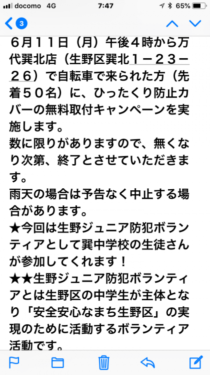 生野警察からも、毎回「安まちメール」で活動予告をして、広く区民に知らせて頂いて