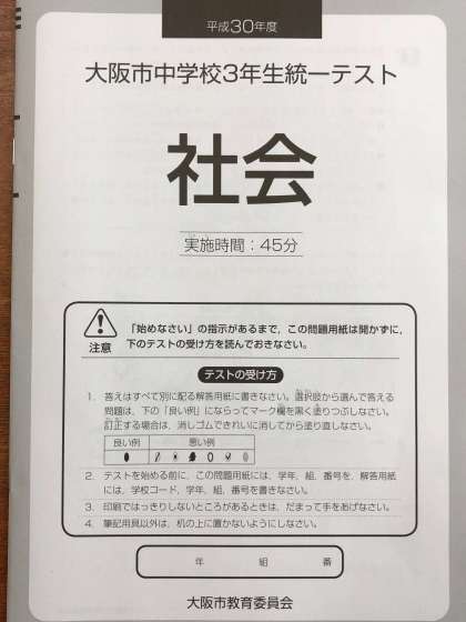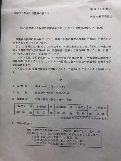 統一テスト実施 其の一 公開日 2018/10/04 更新日 2018/10/04 お知らせ 本日、平成30年度大阪市中学校3年生統一テストを行いました。 このテスト結果により、大阪市中学校全校の教科ごとの得点分布による評定を与えられま す。 いいね(0)