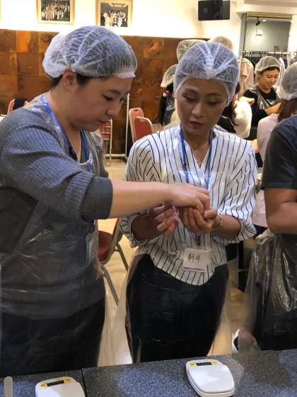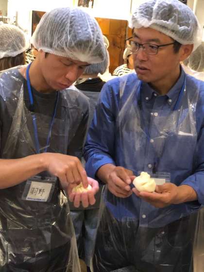 東さん(蓬莱の社長さん)の熱血講習を受けて、いよいよ豚まん作りに挑戦です。