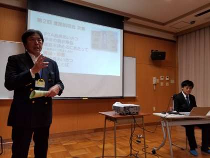 PTA会長のご挨拶の後、3年の学年主任の藤本先生から、この間の学年の取り組みと