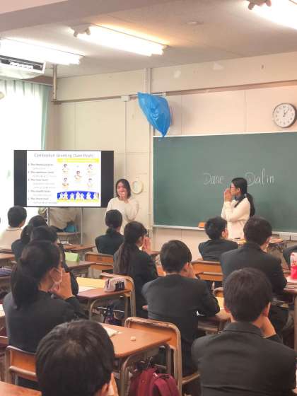 国際理解教育 其の一 公開日 2019/01/09 更新日 2019/01/09 お知らせ 今日、国際理解教育の一環で、1年生がカンボジアから来た大学生と 交流しました。互いの文化の違いや生活習慣を肌で感じる良い機会とな りました。 いいね(0)