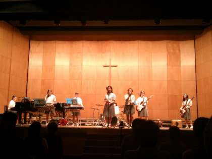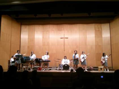 8月31日(日)午後1時からプール学院の立派な講堂で、第5ブロック(生野区・東成区)中学校の音楽会が開催されました。本校からも本年度同好会から部に昇格した「音楽部」の生徒が出場しました。曲は「HELLO-Paradise Kiss」と「夏色」。緊張感あふれる中での演奏でしたが、とても上手に発表することができました。