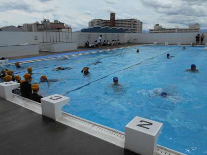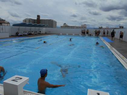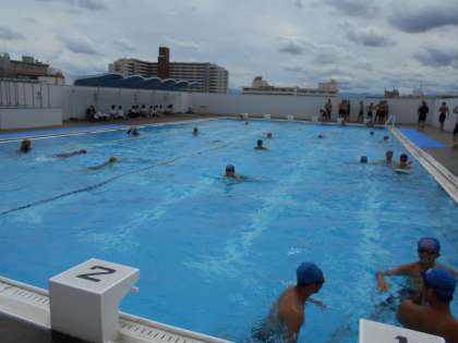 3年生の体育の授業風景です。水泳に取り組んでいます。男女ともに、バタフライに挑戦しています。水泳の授業も終わりに近づく中、一生懸命取り組んでいました。2年所属の小林先生も水泳の手本を生徒たちの前で披露していました。圧巻のスピードに拍手が巻き起こっていました。