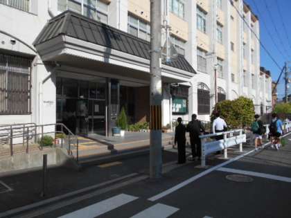 玄関では、生徒会候補の生徒があいさつをしてくれています。
