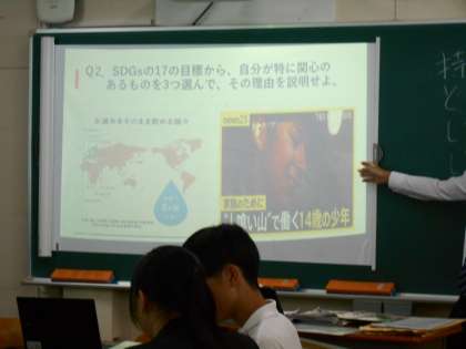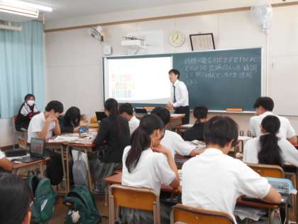 社会は教育実習生による授業が行われています。テーマはSDGSです。世の中が抱える様々な問題について、学習しこれから、何を思い、どう行動していくか… 持続可能な社会の担い手である生徒のみなさんが出す答えは社会の在り方を少しずつ変えていくことでしょう。
