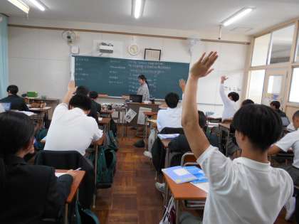 3年1組は英語です。たくさんの手が挙がり、授業に積極的に参加しています。