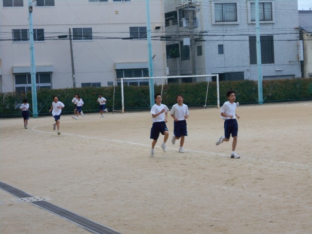 男子は運動場で長距離走を行っています。