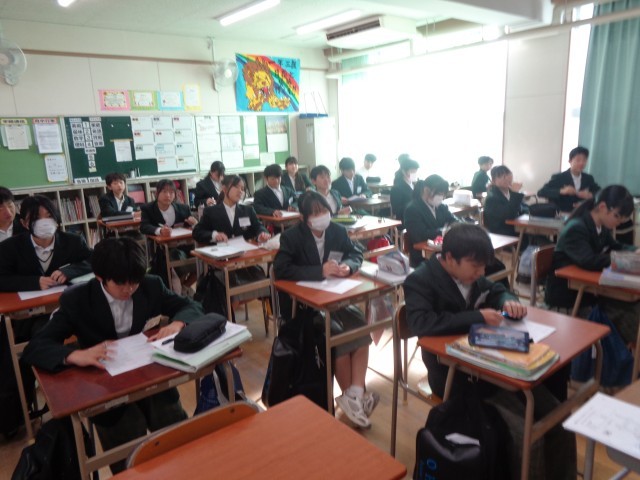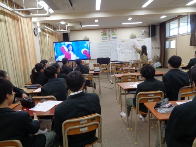 1年3組は英語です。クリスマスソングの聞き取りを行っています。教室はクリスマスモード一色でした。