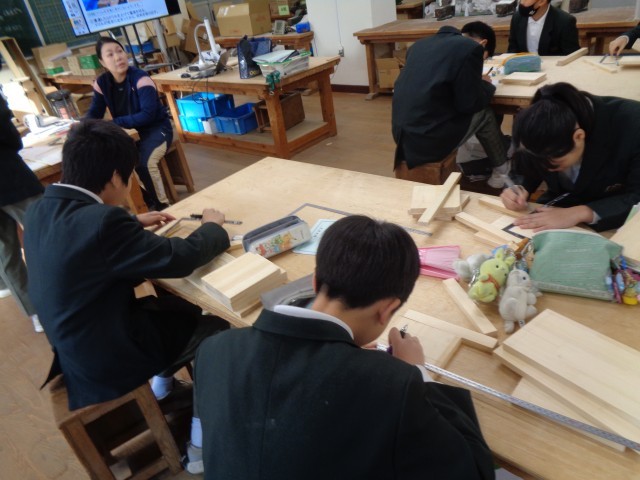 1年2組は技術です。本棚の作成中です。いい本棚を作るために、真剣に採寸しています。