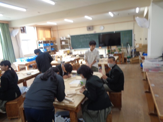 1年2組は技術です。棚を作っています。徐々に形になっています。完成までもう少しです。いい作品を作ってください。
