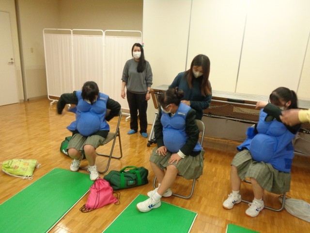実際の病院で丁寧な講義をいただき、班に分かれて体験コーナーでは育児体験などを行いました。