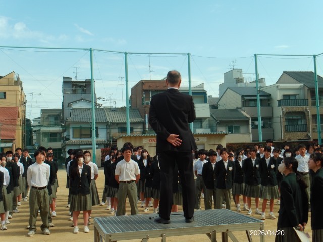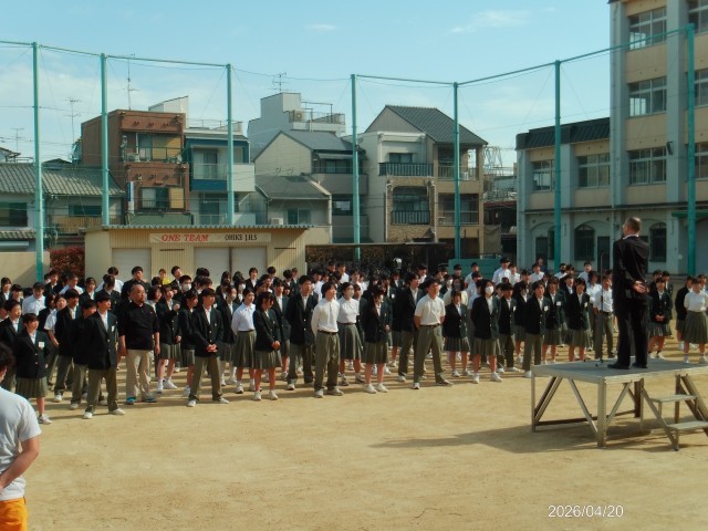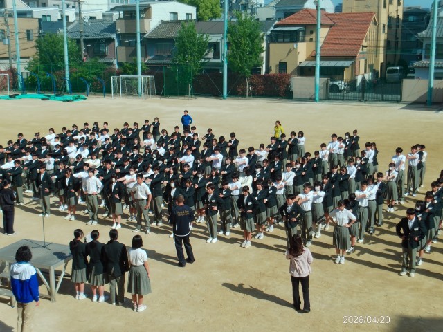 天気にも恵まれ、気持ちのいい朝の中、グランドでの全校集会です。