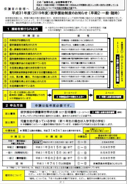 2019年度 就学援助制度のお知らせ(早期2・一般・随時)