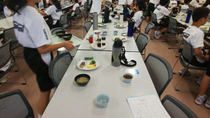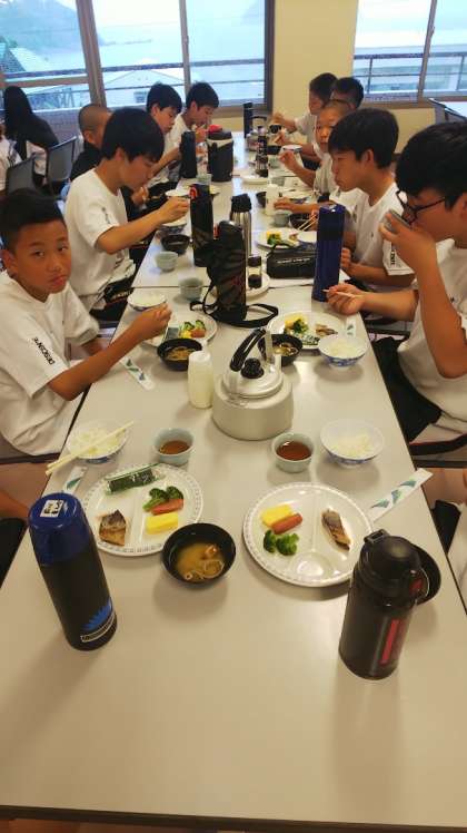 食事係が朝食準備をしています。しっかり食べて、エネルギー補給をしておきましょう。