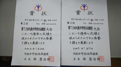 3年生の大山君が大阪府大会の、200mメドレーで三位。400mメドレーで二位を獲得しました。おめでとうございます。