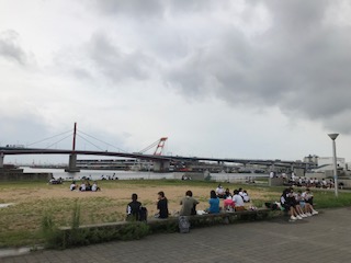 人と防災未来センターでの見学が終わり、雨も止んでいたので、海沿いで昼食タイム。のんびりと過ごしています。